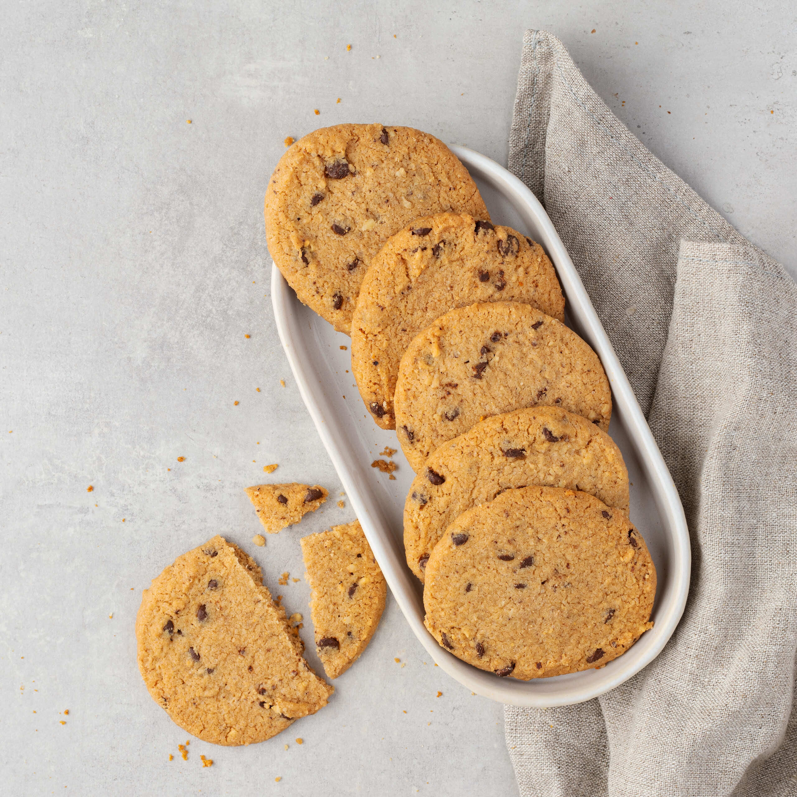 VETEMJÖL, socker, SMÖR, vegetabilisk olja (palm, raps, kokos), farinsocker, potatismjöl, kakaomassa, HASSELNÖTTER, ÄGG, vatten, salt, kakaosmör, arom(vanilj), bakpulver (E450, E500), arom, emulgeringsmedel (E476, solroslecitin), majsstärkelse, naturlig arom (vanilj), vitamin A och D, mjölbehandlingsmedel (E300). Kan innehålla spår av VALNÖTTER & MANDEL.