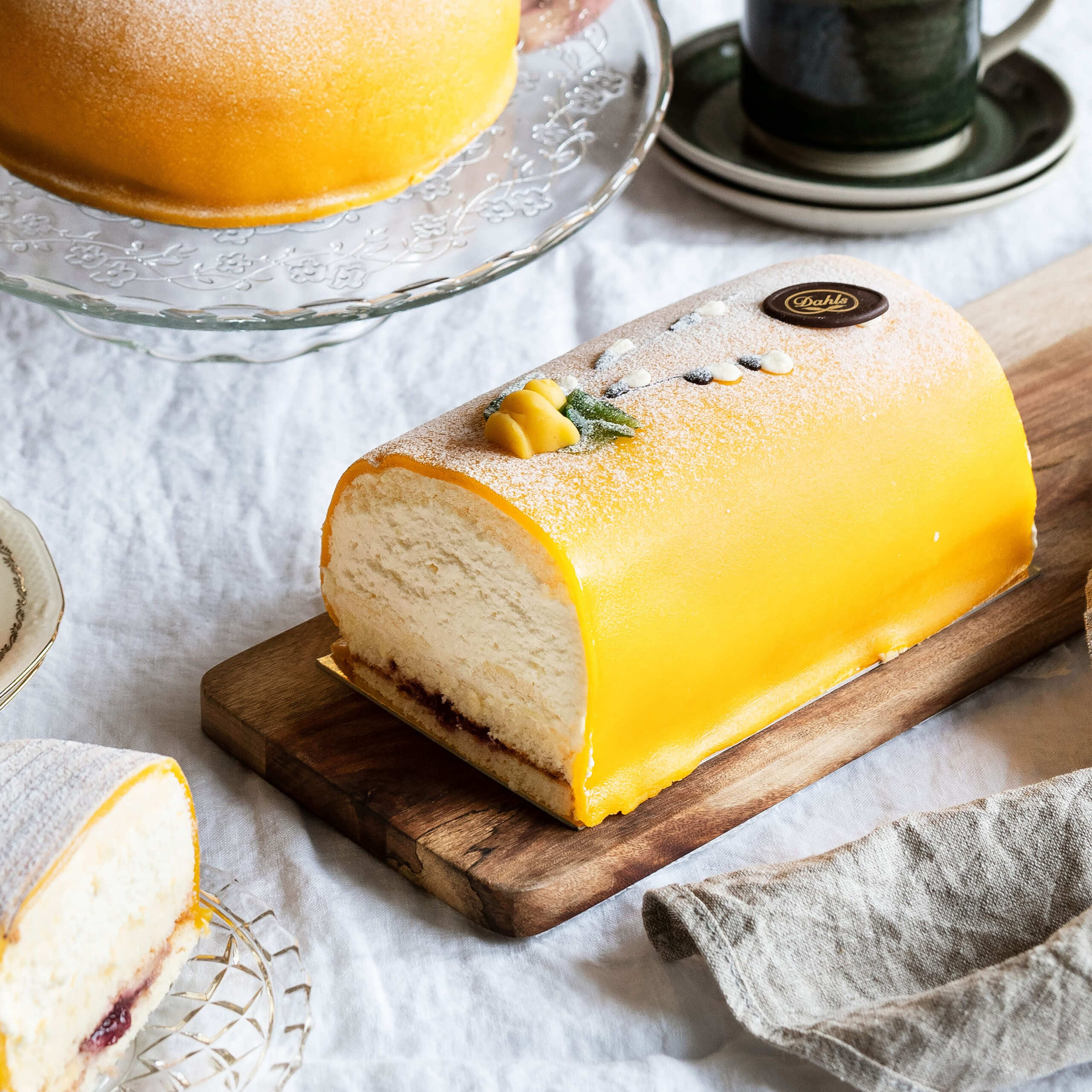 Under det gula marsipantäcket döljer sig hembakade sockerkaksbottnar varvade med len nyvispad grädde, hemkokt vaniljkräm och hallonsylt.