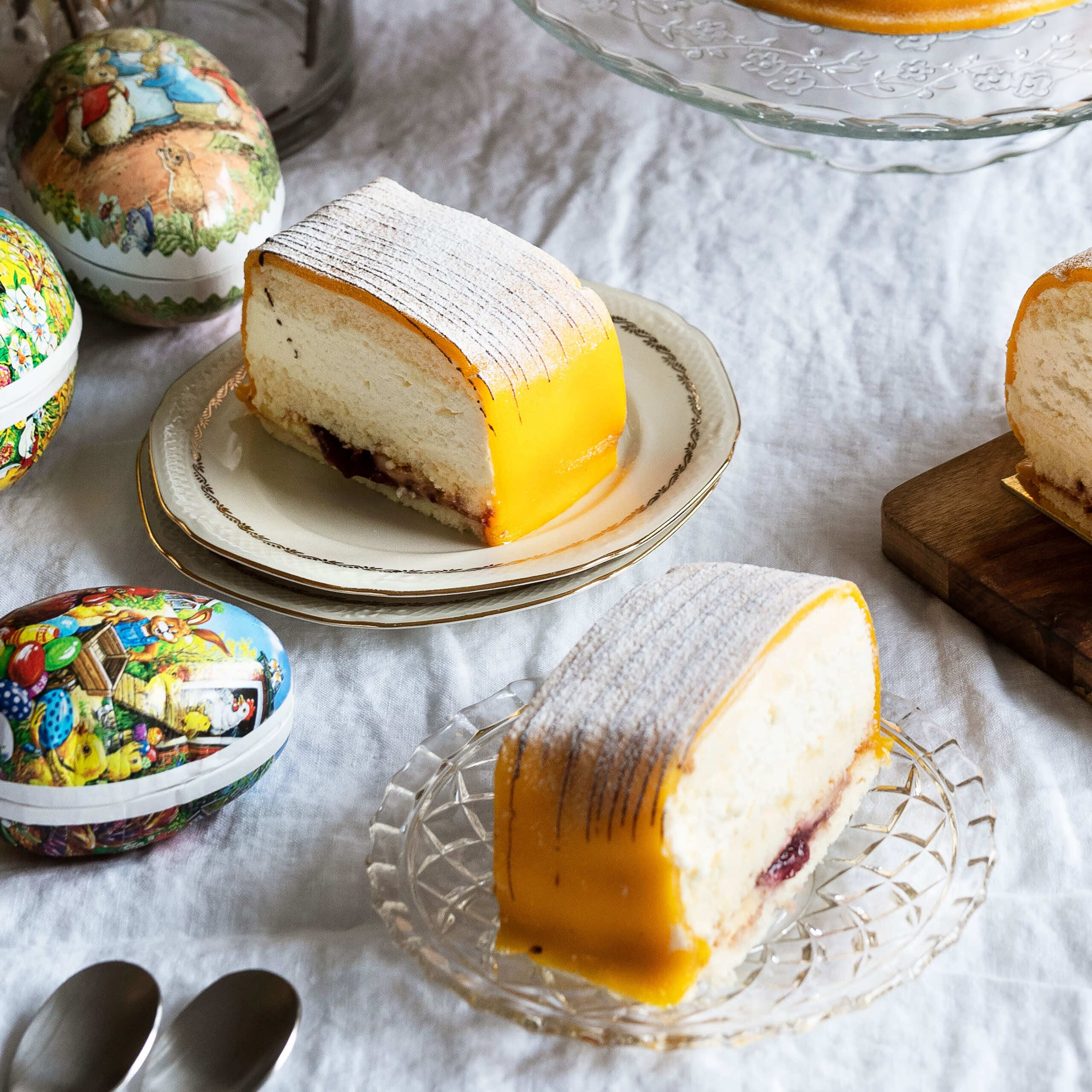 Vår klassiker med hemkokt vaniljkräm och nybakade bottnar täckt av tunn gul marsipan.