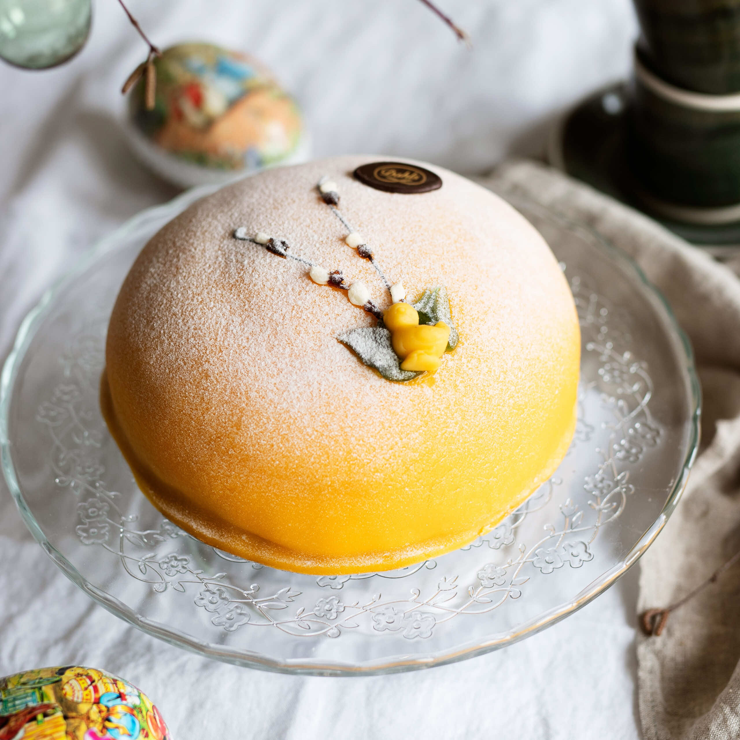 Under det gula marsipantäcket döljer sig hembakade sockerkaksbottnar varvade med len nyvispad grädde, hemkokt vaniljkräm och hallonsylt.
