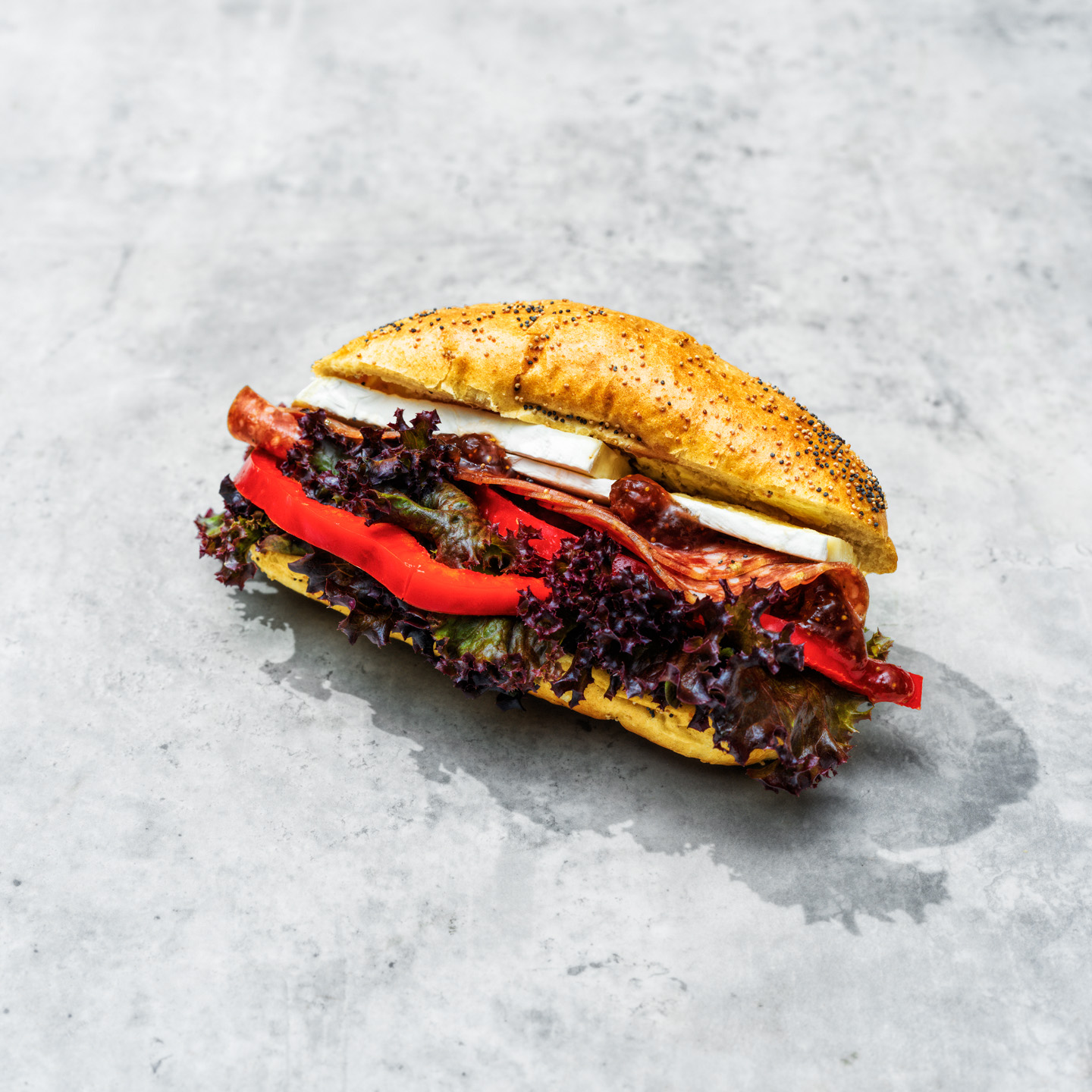Vallmobaguette med smör, brieost, fänkåls -och svartpepparsalami, fikonmarmelad, röd paprika och krispsallad.